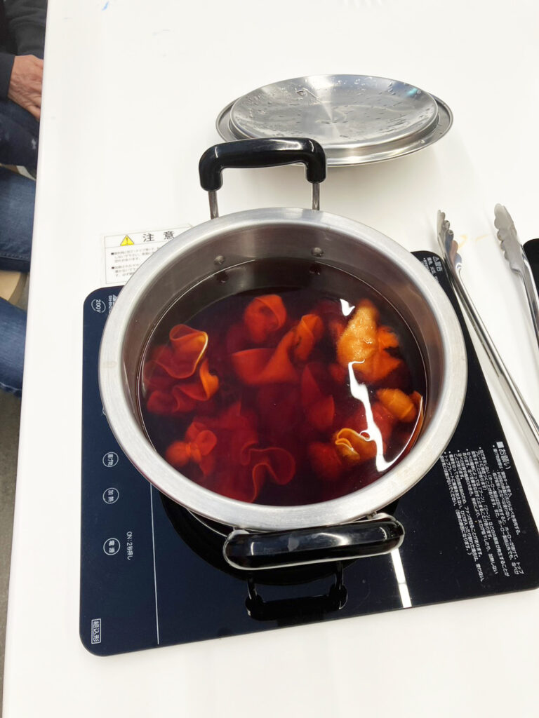 自然素材ならではの色合い、色止め前後の変化など、学びと発見の詰まった工程が、参加者の満足度につながったように感じました。