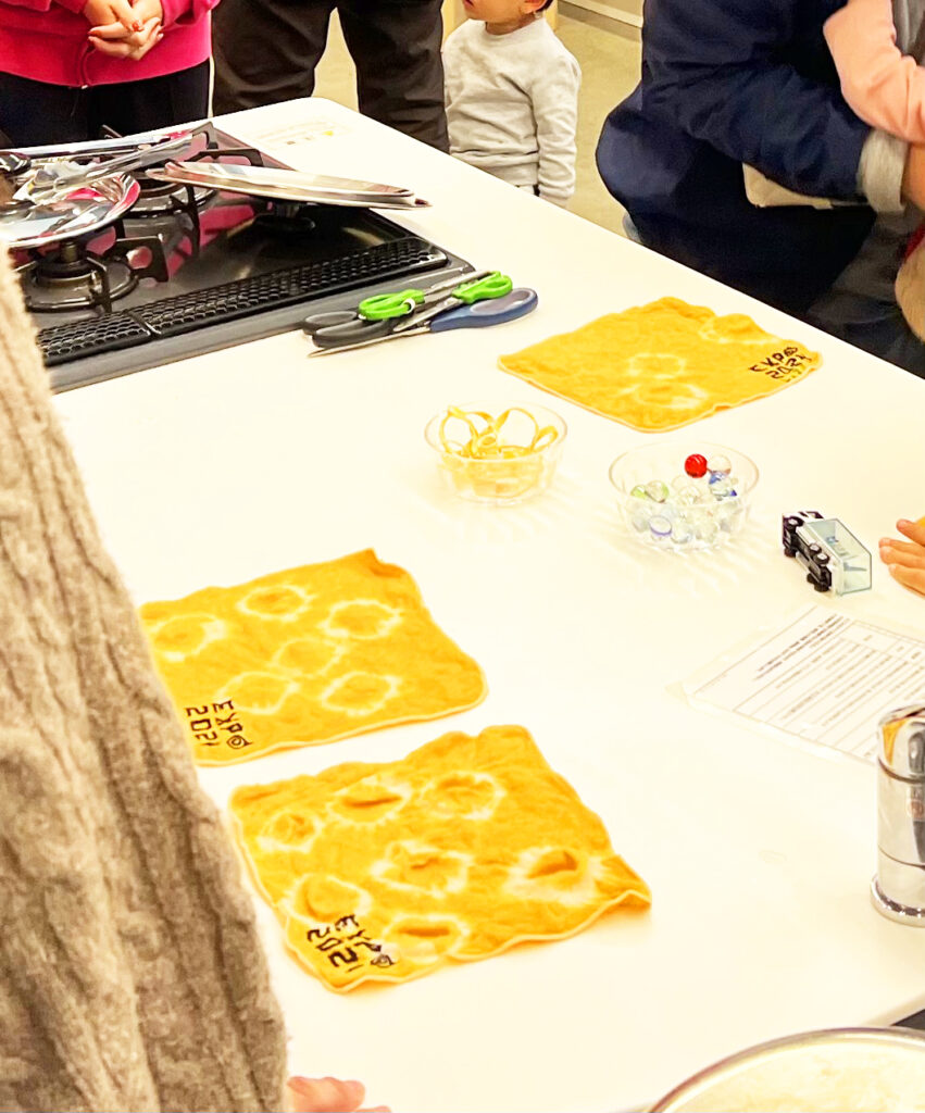 「どんな色に染まるんだろう?」という期待がテーブルから伝わり、あちこちで試行錯誤する様子が見られました。自然の色で染まっていく工程は、大人も子どもも夢中になる体験となりました。